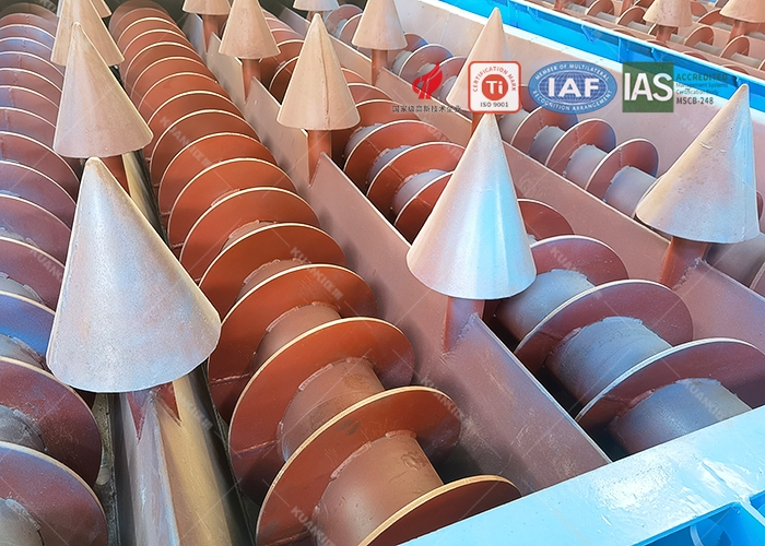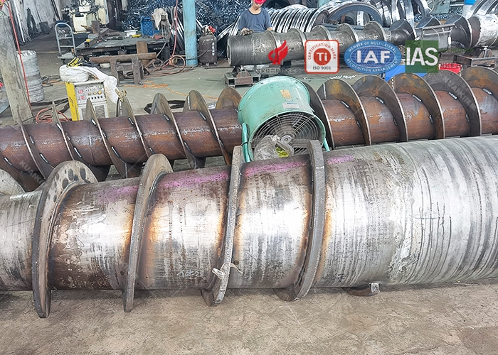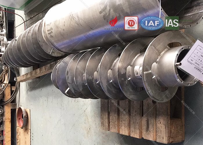造纸厂螺旋轴主要用于过程输送、搅拌、压榨等,其螺旋叶片有实体螺旋面、带式螺旋面和叶片螺旋面三种形式,螺旋压榨轴整轴制作需要考虑压缩比,输送轴表面是否有亮点、整轴加工焊接是否符合拍片探伤要求、整轴加工几何尺寸是否符合要求等,整轴在使用过程中与纤维接触部位较易磨损,易损部位全做耐磨层处理。
